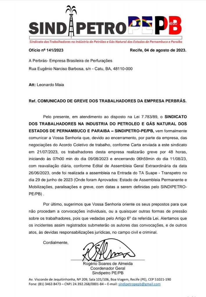 Pelo presente, em atendimento ao disposto na Lei 7.783/89, o SINDICATO DOS TRABALHADORES NA INDUSTRIA DO PETROLEO E GÁS NATURAL DOS ESTADOS DE PERNAMBUCO E PARAIBA – SINDIPETRO-PE/PB, vem formalmente comunicar a Vossa Senhoria que, devido ao encerramento, por parte da empresa, das negociações do Acordo Coletivo de trabalho, conforme Carta enviada a este sindicato em 21/07/2023, os trabalhadores desta empresa realizarão greve por 48 horas, iniciando às 07h00 min do dia 09/08/2023 e encerrando 06h59min do dia 11/08/23, com reavaliação diária, conforme Edital de Assembleia Geral Extraordinária da data 26/06/2023, onde foi realizada a assembleia na Entrada do TA Suape – Transpetro no dia 29 de junho de 2023 (Onde foram Aprovados: Estado de Assembleia Permanente e Mobilizações, paralisações e greve, com datas a serem definidas pelo SINDIPETRO-PE/PB).