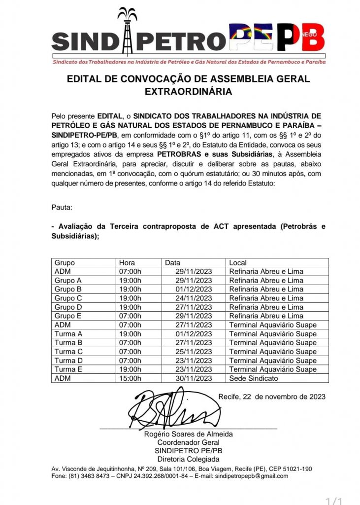 Pelo presente EDITAL, o SINDICATO DOS TRABALHADORES NA INDÚSTRIA DE PETRÓLEO E GÁS NATURAL DOS ESTADOS DE PERNAMBUCO E PARAÍBA – SINDIPETRO-PE/PB, em conformidade com o §1º do artigo 11, com os §§ 1º e 2º do artigo 13; e com o artigo 14 e seus §§ 1º e 2º, do Estatuto da Entidade, convoca os seus empregados ativos da empresa PETROBRAS e suas Subsidiárias, à Assembleia Geral Extraordinária, para apreciar, discutir e deliberar sobre as pautas, abaixo mencionadas, em 1ª convocação, com o quórum estatutário; ou 30 minutos após, com qualquer número de presentes, conforme o artigo 14 do referido Estatuto: