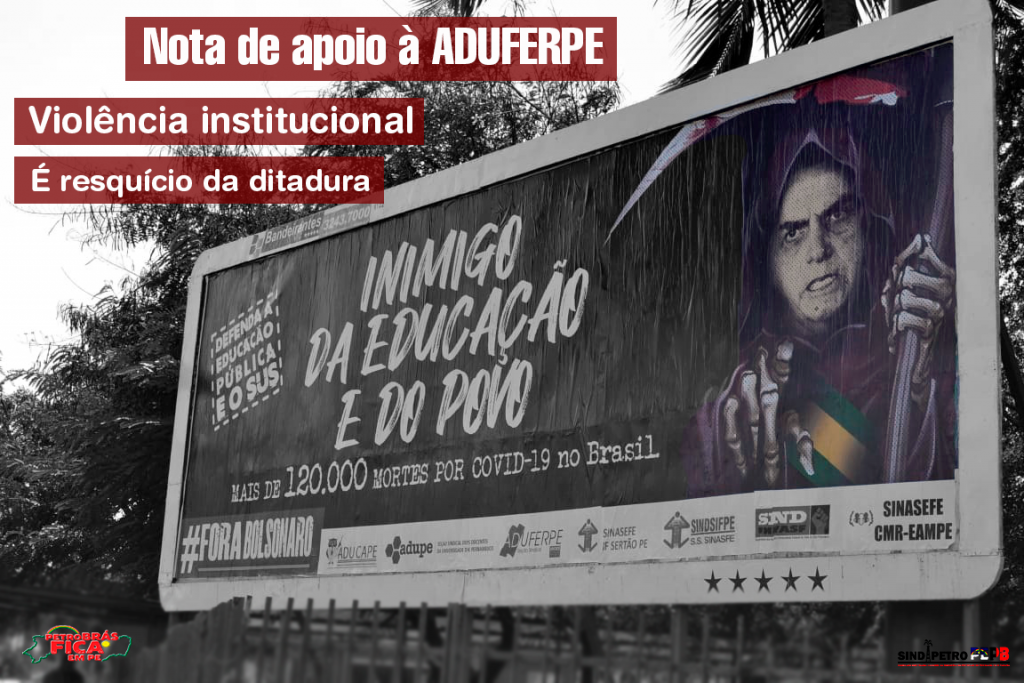 Como entidade de representação de classe e opositora das práticas empreendidas por Jair Bolsonaro e seus apoiadores, o Sindipetro PEPB se solidariza e expressa seu apoio à professora Erika Suruagy, à ADUFERPE e todos os professores, professoras, trabalhadores e trabalhadoras do serviço público, bem como toda e qualquer pessoa que se veja perseguida pelas práticas autoritárias de um governo com claras intenções ditatoriais. Acreditamos que é preciso combater as práticas de violência institucional, antes que as mais grotescas violências de Estado tornem a emergir dos porões da ditadura, a maldita latrina que pariu Jair Messias Bolsonaro e seu milicianato.