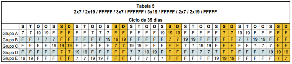 Na Refinaria Abreu e Lima, este processo foi iniciado em outubro, quando o Sindipetro realizou assembleias para eleger uma tabela de 8h laborais. Das cinco propostas apresentadas na ocasião, os trabalhadores e trabalhadoras optaram pela tabela de número 1 (Figura 3). No mês seguinte, outras oito propostas foram trazidas para deliberação, desta vez com jornadas de 12h. Após as assembleias, a escala de número 5 (Figura 4) foi selecionada pelos(as) votantes.